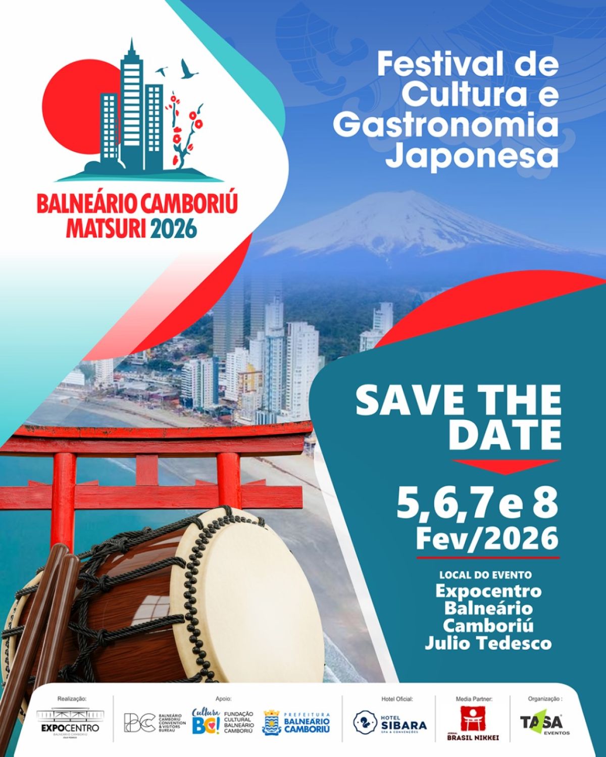 O BALNEÁRIO CAMBORIÚ MATSURI ocorrerá nos dias 05, 06, 07 e 08 de fevereiro de 2026, um evento de cultura e gastronomia japonesa com os principais artistas e destaques da comunidade japonesa do Brasil: shows, musicais, danças folclóricas, culinária oriental, taiko, exposições, concurso de cosplay, bonsai, ikebana, furoshiki, oshibana, origami e muito mais!